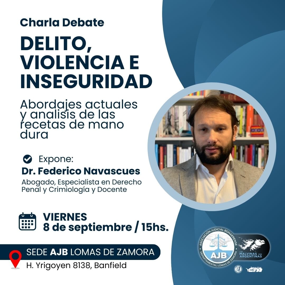 La charla debate comenzará a las 15 hs y estará a cargo de Federico Navascués, abogado, docente, y especialista de Derecho Penal y Criminología.